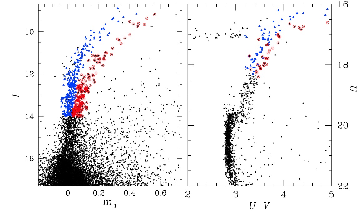red and blue colours. Right panel: Stars selected in the
